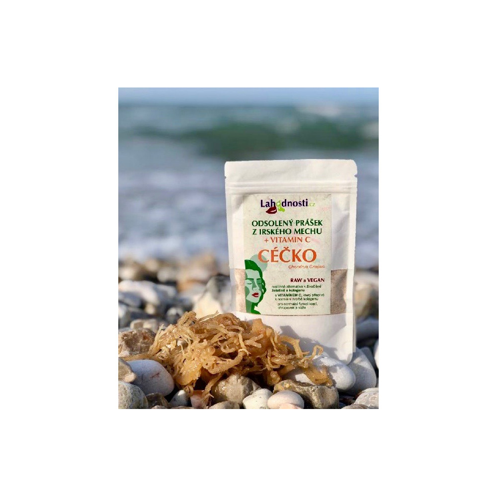 CÉČKO: ODSOLENÝ PRÁŠEK Z IRSKÉHO MECHU (Chondrus crispus) + VITAMIN C, který přispívá k normální tvorbě kolagenu, pro normální funkci kostí, chrupavek a kůže.
